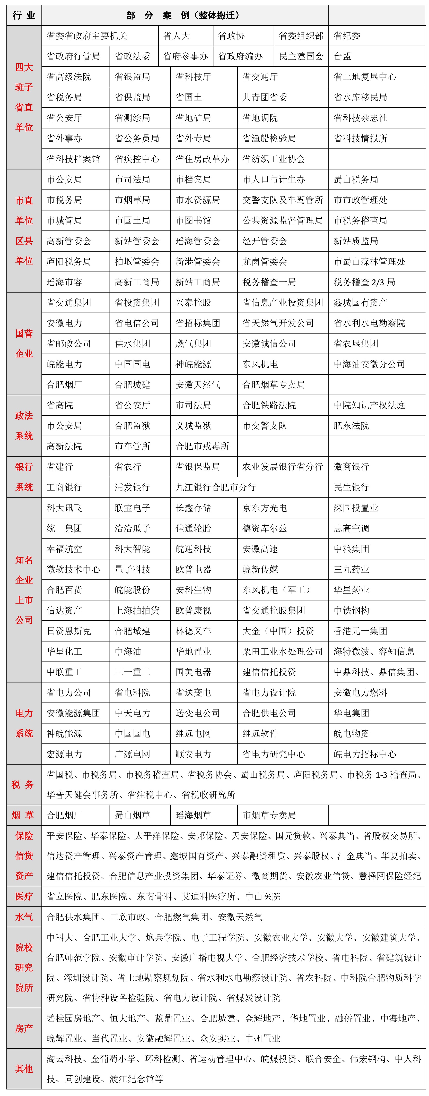 5、单位搬迁、设备搬迁、设备配送等客户遍地开花,涉及小型、中型、大型、特大型,有设备搬迁、外资企业、政府单位、国企、私营企业、上市公司、银行金融、电力电信、制造企业、厂矿等所有行业,特别是完成了部分大型企业的整体搬迁任务,如2012年度合肥搬迁行业规模之最的超大特大型搬迁:安徽中烟合肥卷烟厂整体搬迁,合肥新站管委会整体搬迁(因为口碑好,后期迎来多个下属公司及单位的搬迁)、合肥兴泰控股集团及所有下属企业整体搬迁、安徽皖通科技有限公司整体搬迁、欧普电器大型仓库、国电电力、安徽农业银行、安徽中人科技设备厂房(及办公、实验室、生产车间等)、农大动物科技学院实验大楼搬迁等。